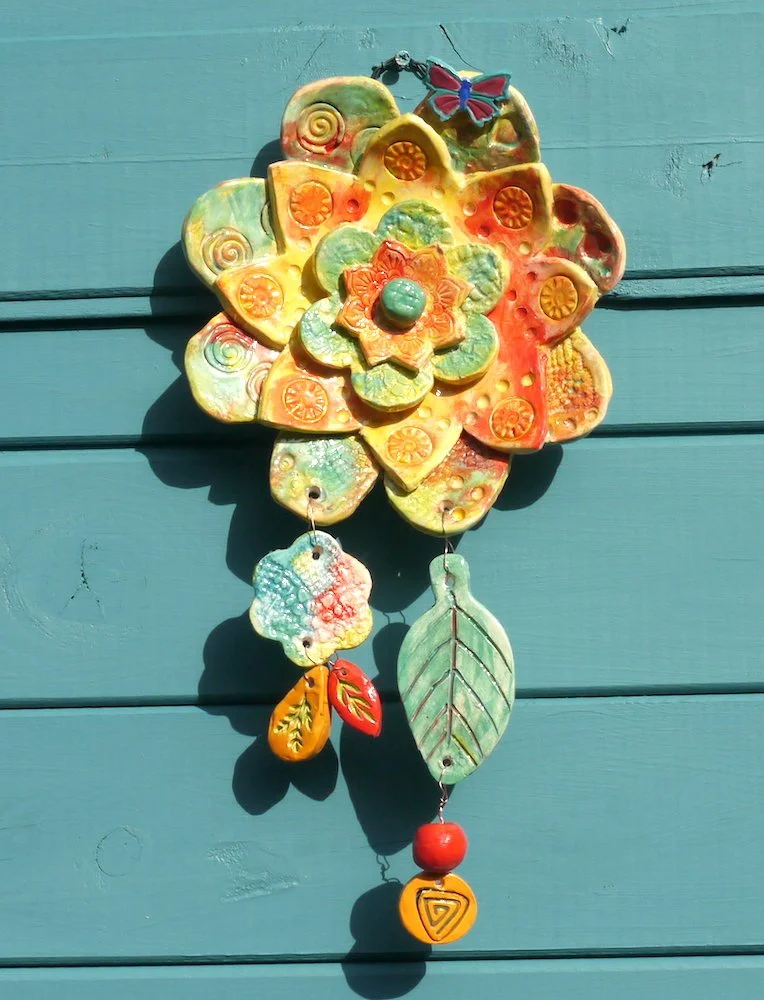 A layered, brightly coloured, ceramic flower that can hang on a garden fence or inside on a wall.