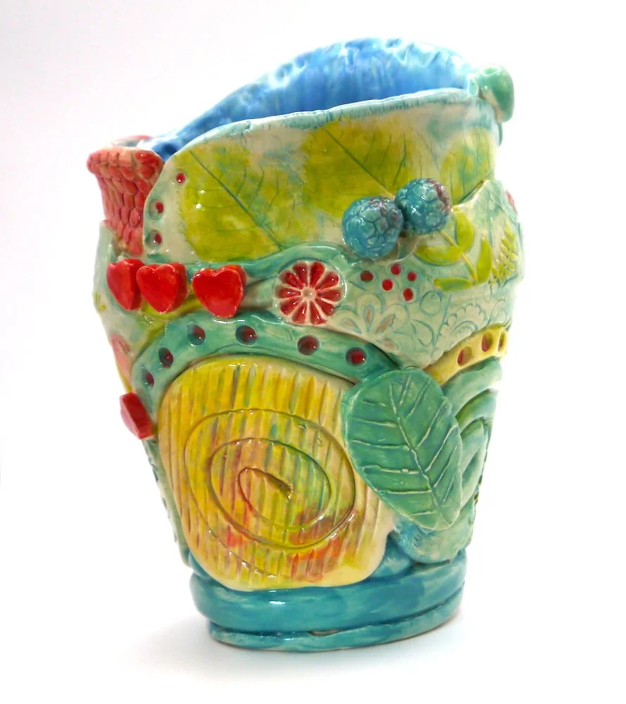 Colourful pot or vase covered in hearts, leaves and flowers - a Midsummer’s Day beauty.